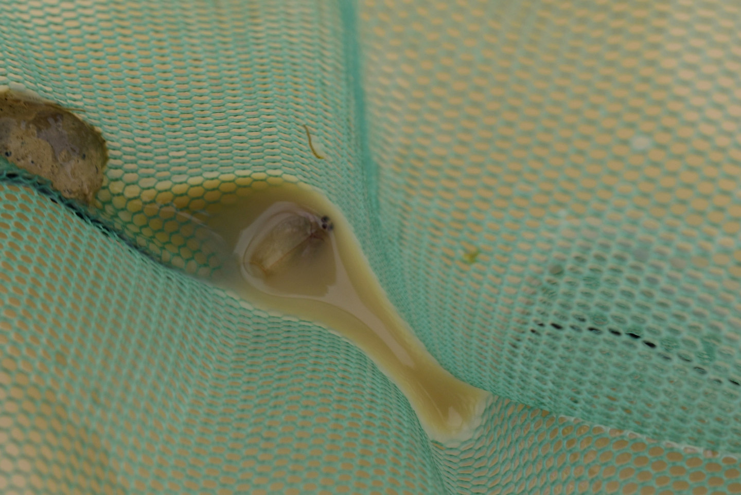 One fairy shrimp with eggs in the net at Playa Wire Gate Pond. Its head is at upper left and its ovisac with pale eggs is at lower right.